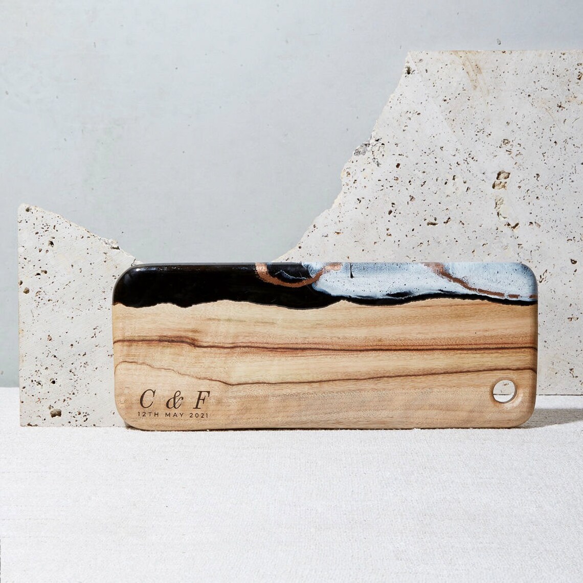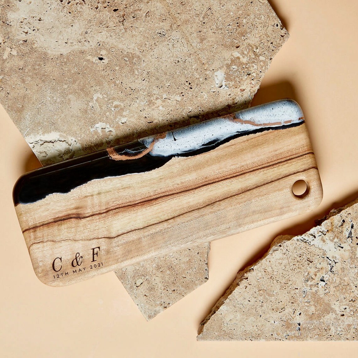 Кухненски борд изработен от епоксидна смола и маслиново дърво.