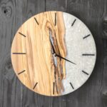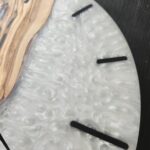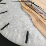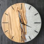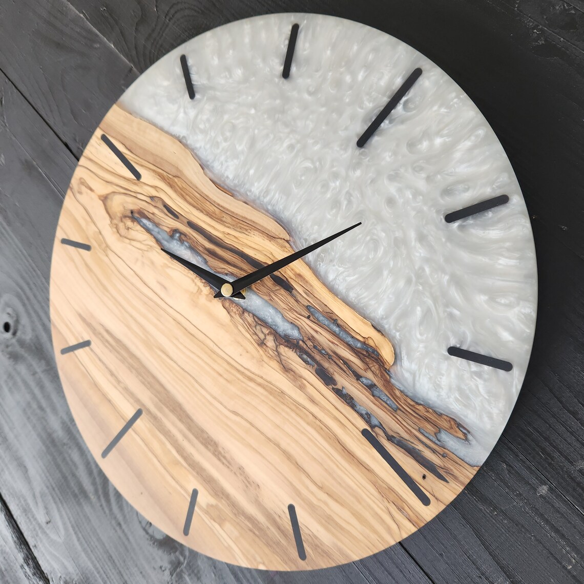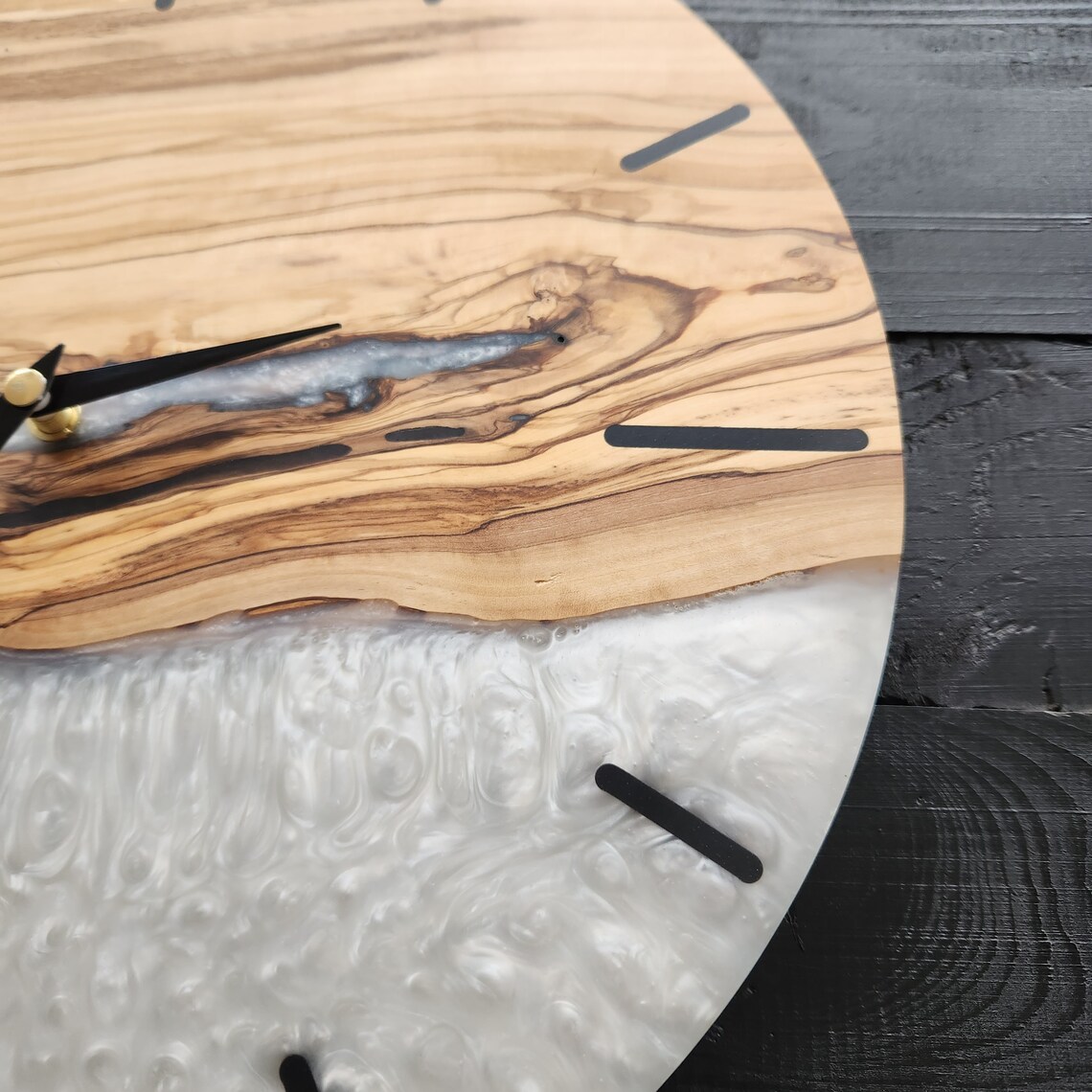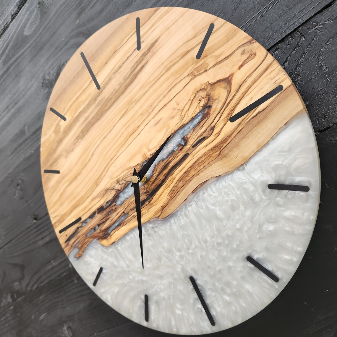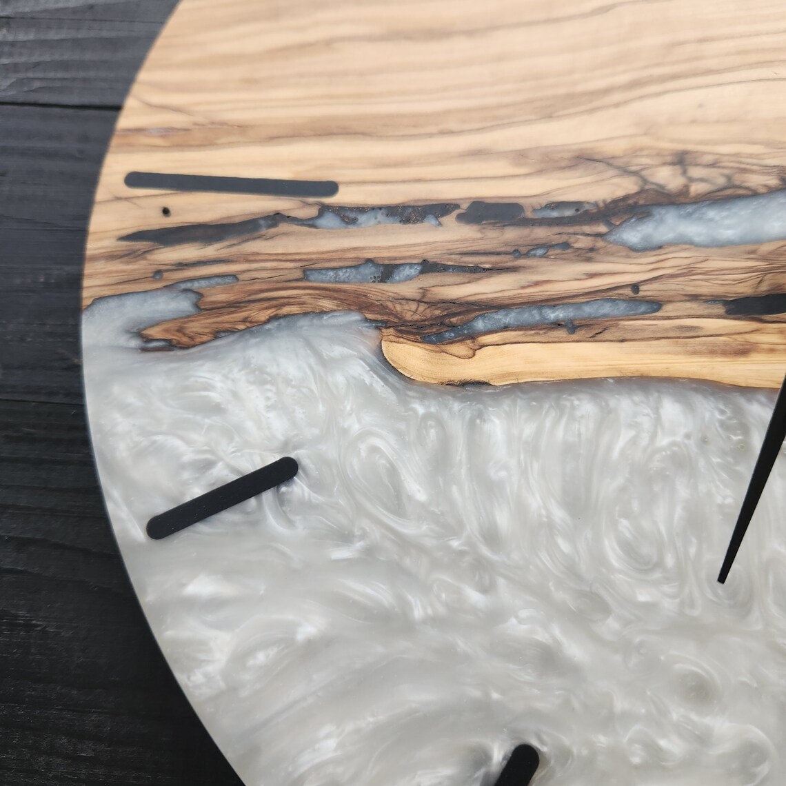 POSHJEWEL.bg Ви предлага изключителен Стенен часовник изработен от епоксидна смола и маслиново дърво.