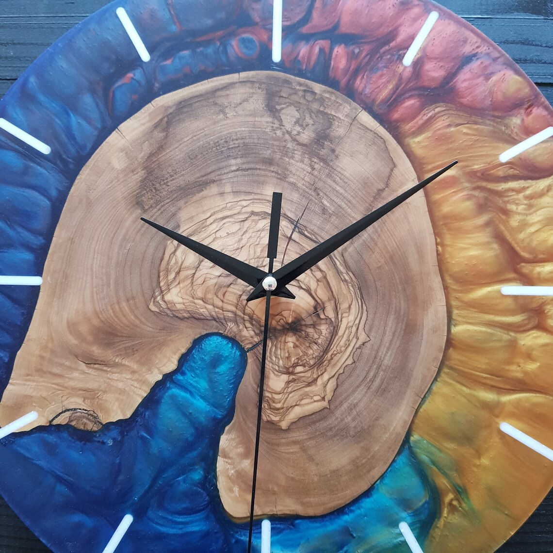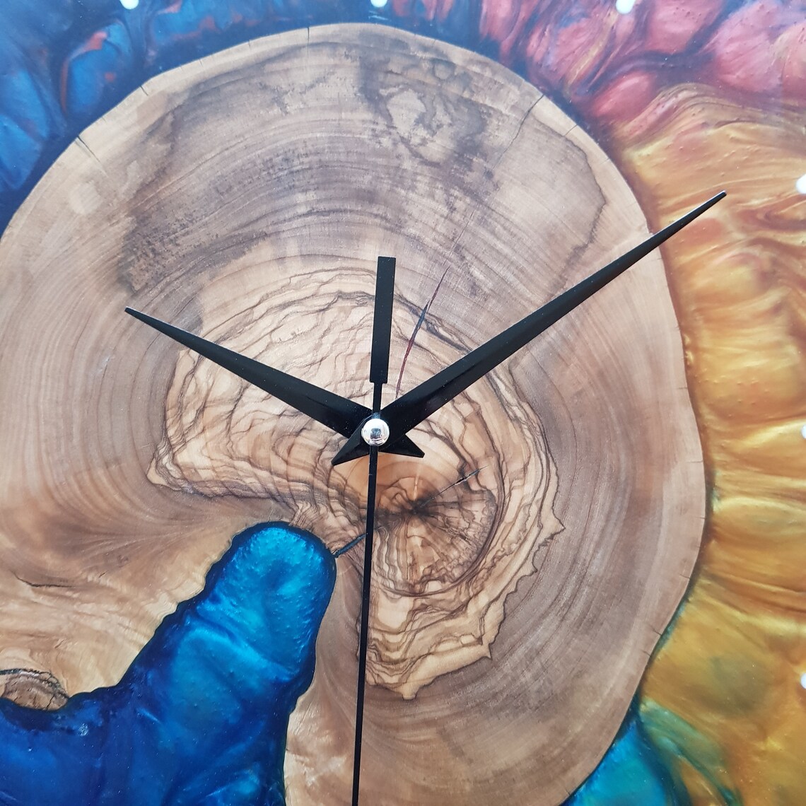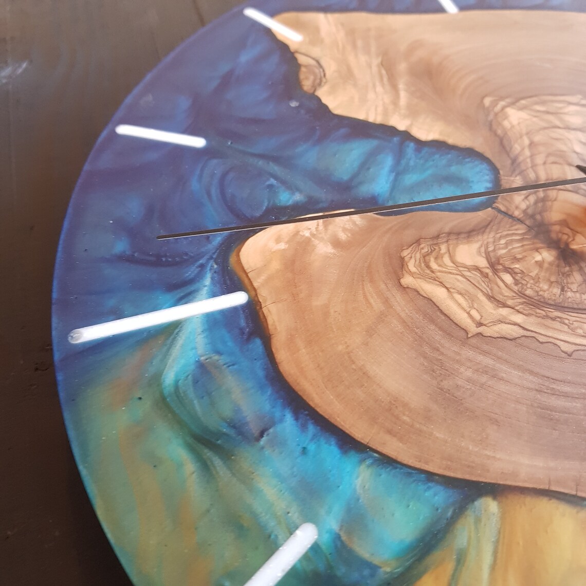 POSHJEWEL.bg Ви предлага изключителен Стенен часовник изработен от епоксидна смола и маслиново дърво.