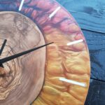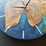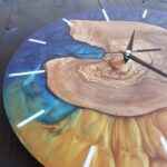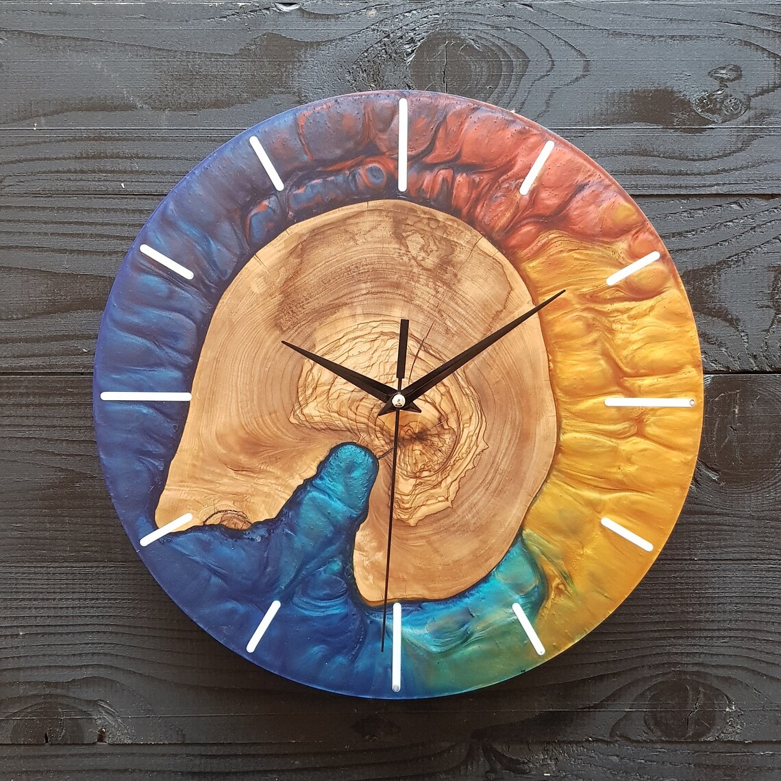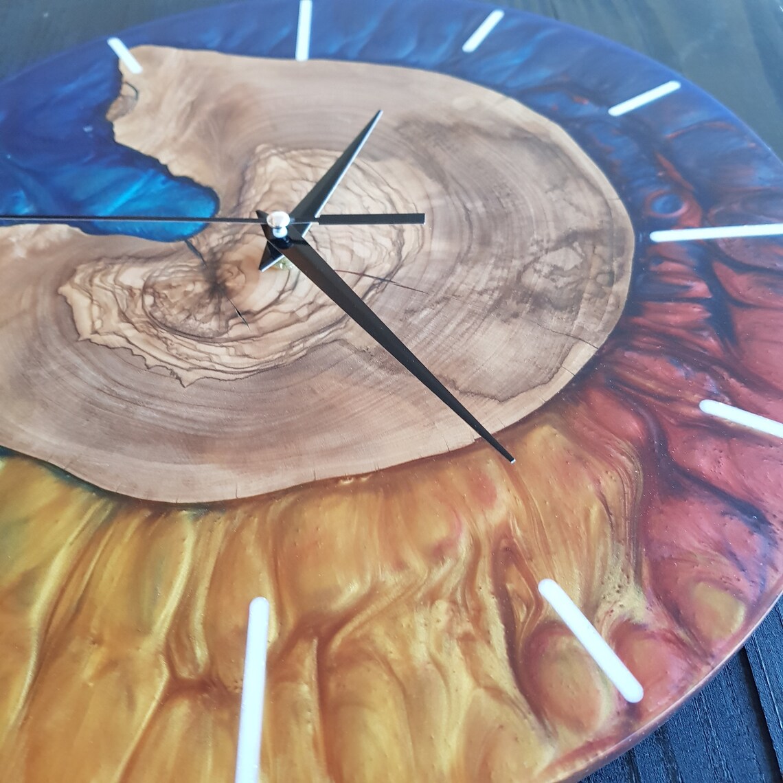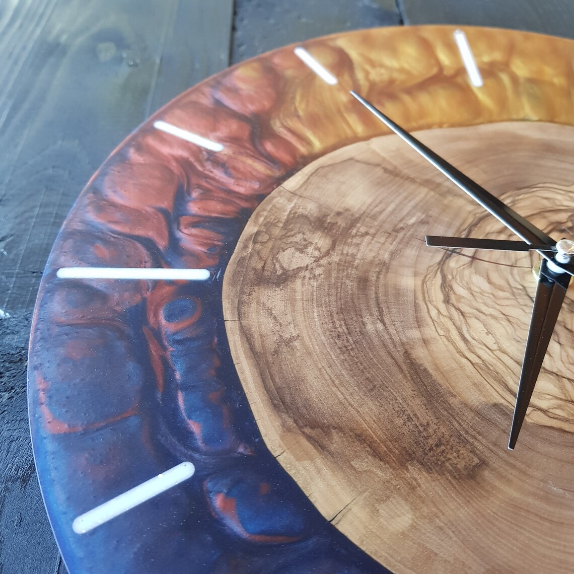 POSHJEWEL.bg Ви предлага изключителен Стенен часовник изработен от епоксидна смола и маслиново дърво.